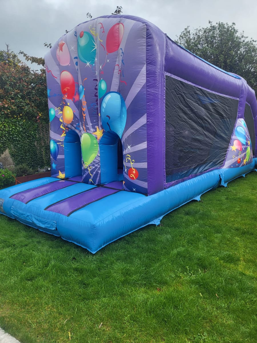 10 ft x 30 ft Purple/Blue Fun Run is great inflatable for boys and girls of all ages. As you go through the entrance there is bish and bash pillars you have to go through navigate through. Then you have to climb up a few steps and down the slide as fast as you can to see who was the fastest !
